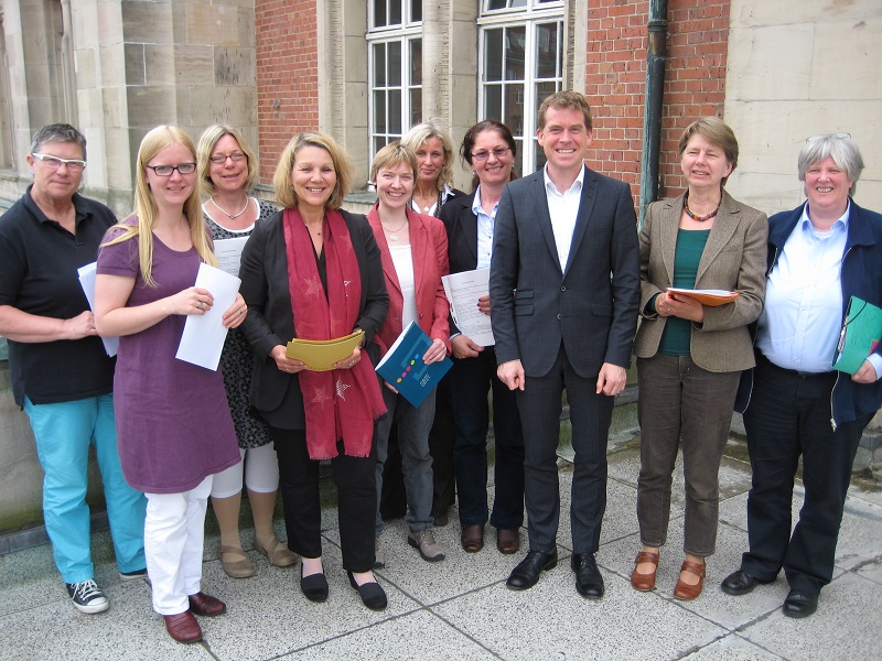 Der Oberbürgermeister Dr. Ulf Kämpfer unterzeichnet am Montag, 19. Mai 2014 mit Kieler Mädchen- und Frauenfacheinrichtungen Anschlusszuwendungsverträge für die Jahre 2014 bis 2016. Aktuell starten die neuen Verträge mit dem Frauennotruf Kiel e.V., Mädchenhaus Kiel – Lotta e.V., TIO e.V., Frauentreff – Beratung, Treffpunkt und Information für Frauen e.V., Frauenhaus Kiel e.V. – Lerche und Psychosoziale Frauenberatung donna klara e.V. Der Verbund der feministischen Mädchen- und Frauenfacheinrichtungen freut sich über den Abschluss der Verträge und das entsprechend klare Zeichen der Landeshauptstadt Kiel. Juliane Bendixen, Sprecherin des Verbundes, bedankt sich auch im Namen der anderen Vereine bei der Ratsversammlung, der Verwaltung und dem Oberbürgermeister für dieses deutliche Signal der Landeshauptstadt Kiel. „Damit ist die kommunale Finanzierung der notwendigen Arbeit der Frauenfacheinrichtungen in der Landeshauptstadt Kiel für weitere 3 Jahre gesichert. Die Vereine erhalten die dringend notwendige Planungssicherheit.“ Gerade auch in Zeiten von schwierigen finanziellen Haushaltslagen ist dies ein guter und vorausschauender Schritt der Stadt Kiel in Richtung Geschlechtergerechtigkeit und Chancengleichheit.